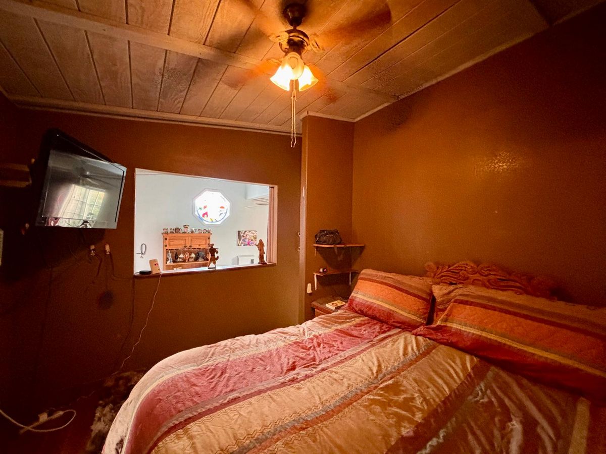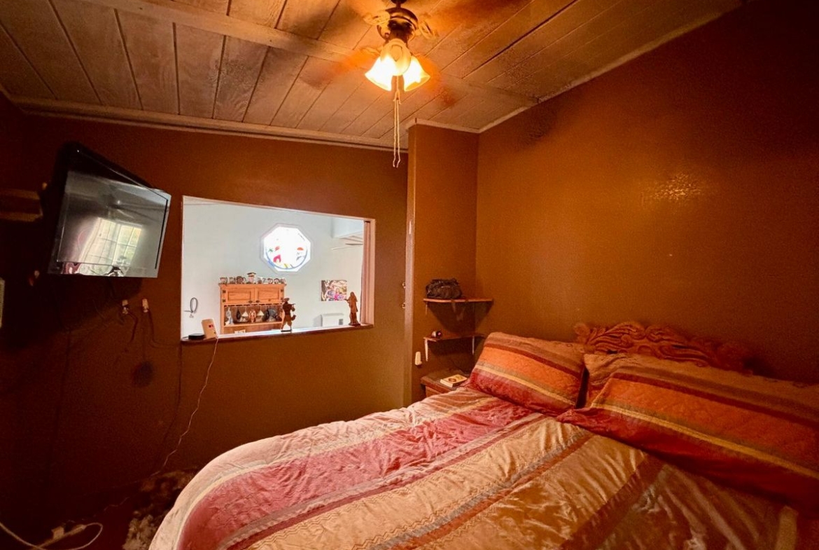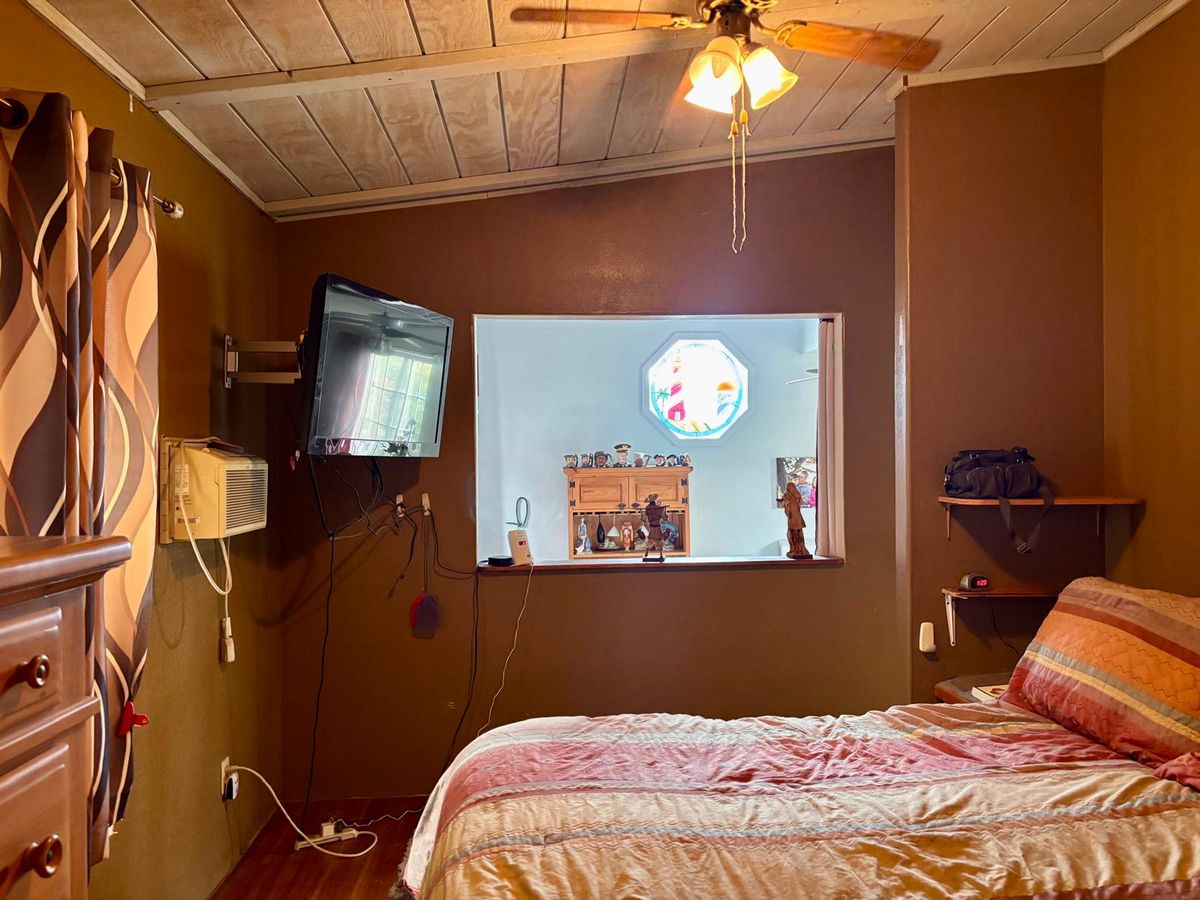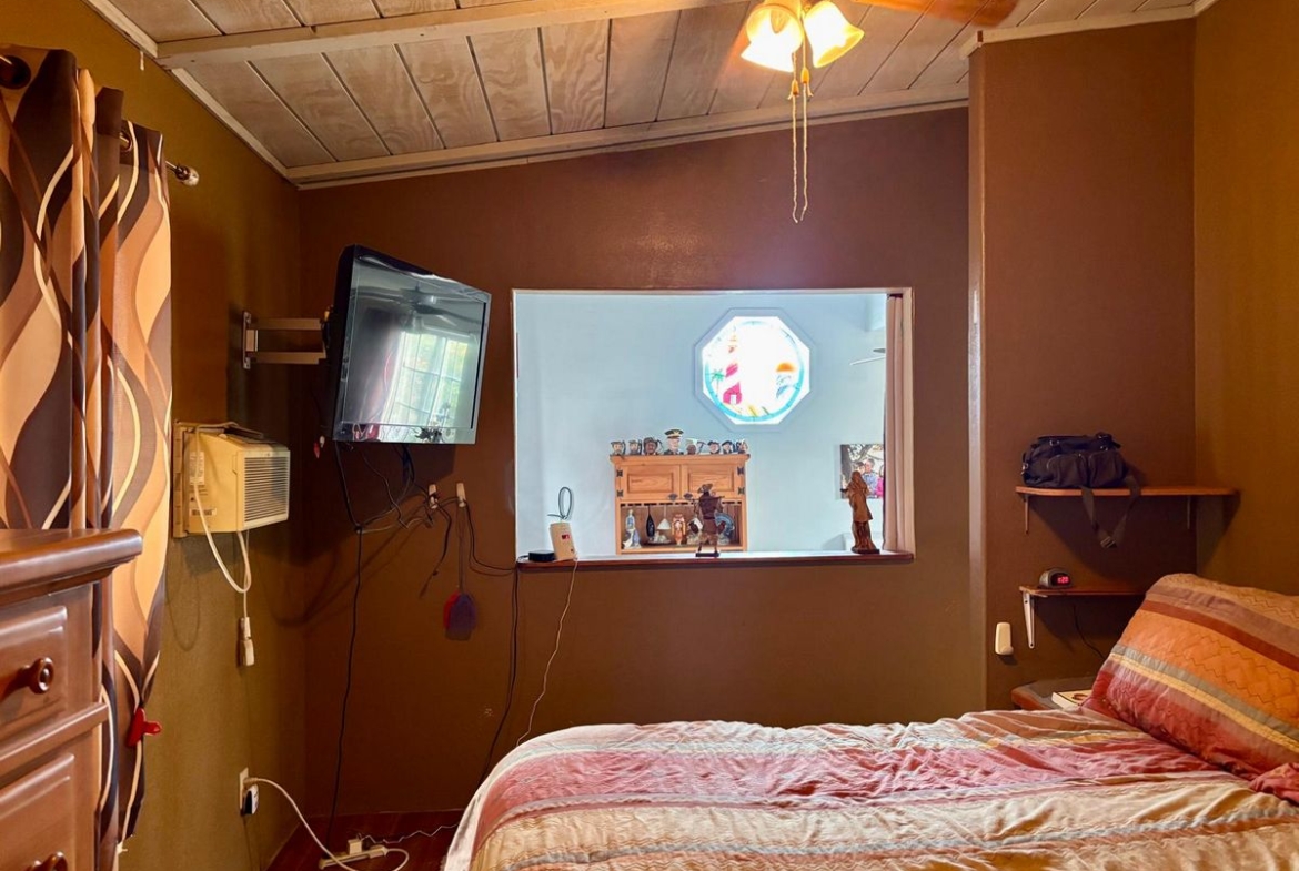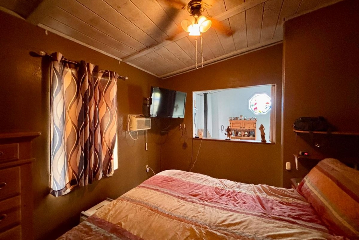 1 recámara amplia con unidad de A/C montada en pared y ventilador de techo