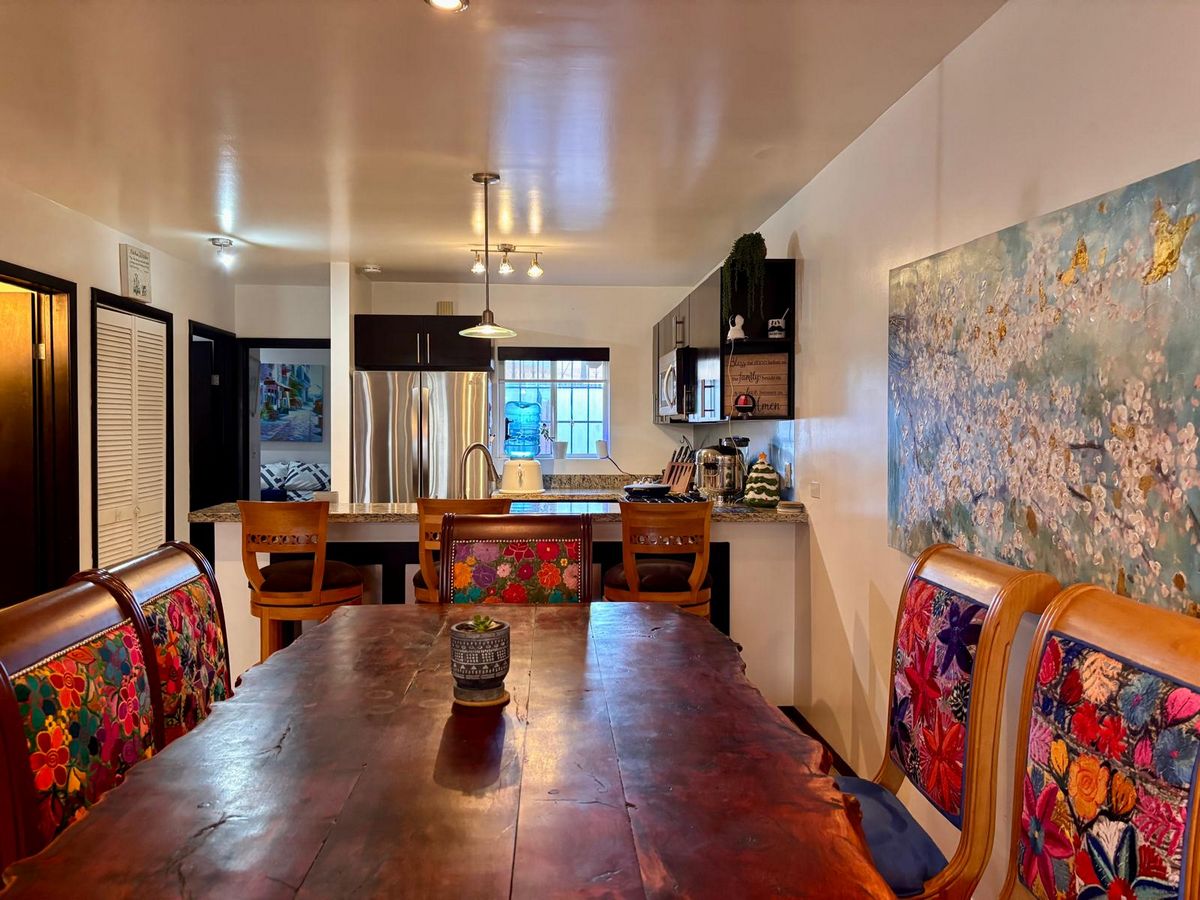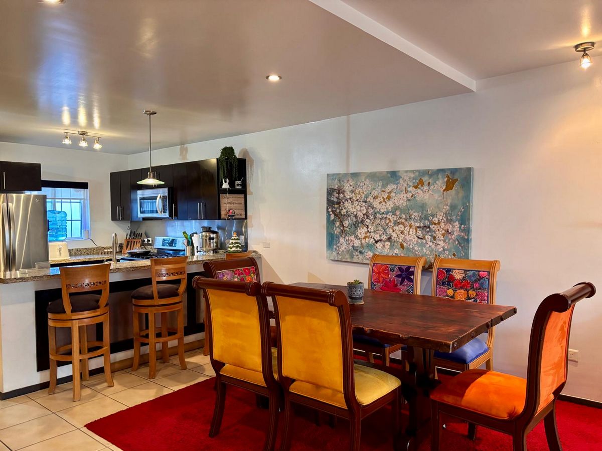 - Vibrant dining area with colorful upholstered chairs and artistic wall décor