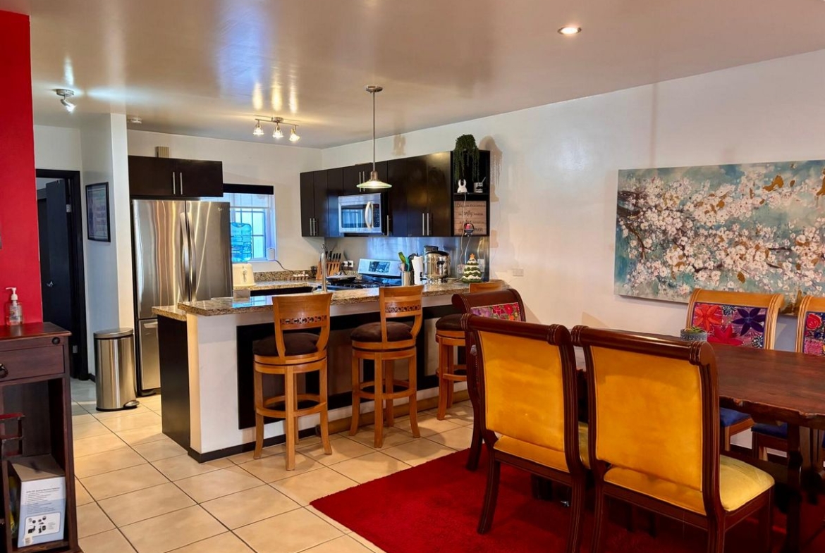 - Modern kitchen with granite countertops, stainless steel appliances, and breakfast bar seating