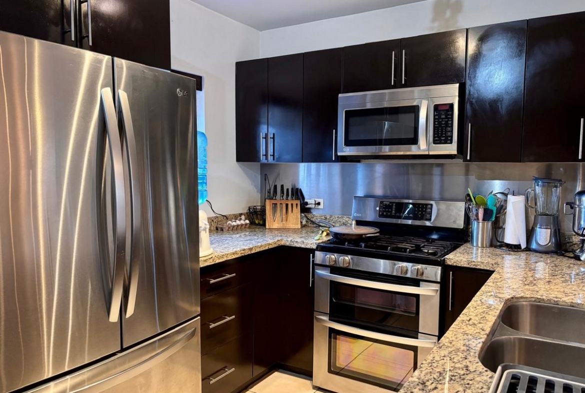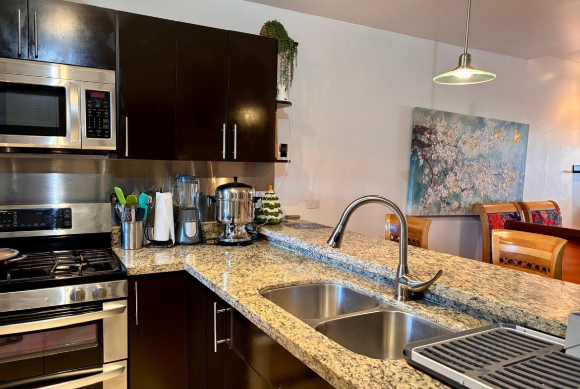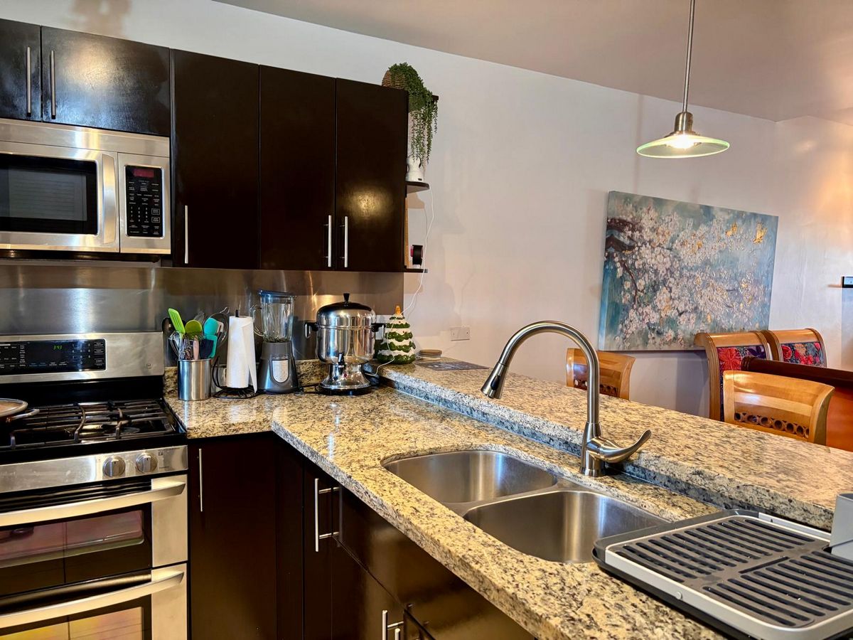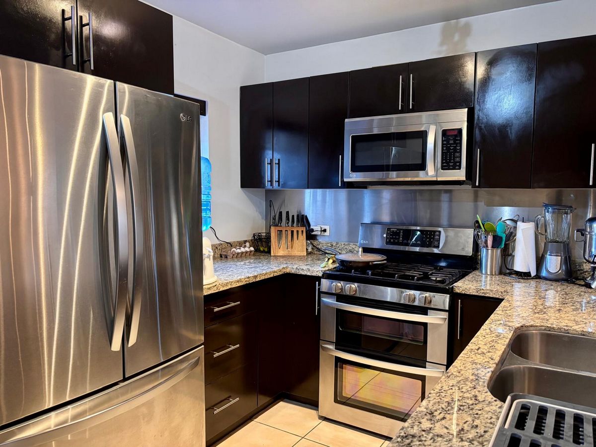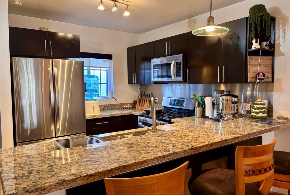 - Cocina moderna con encimeras de granito, electrodomésticos de acero inoxidable y barra desayunadora